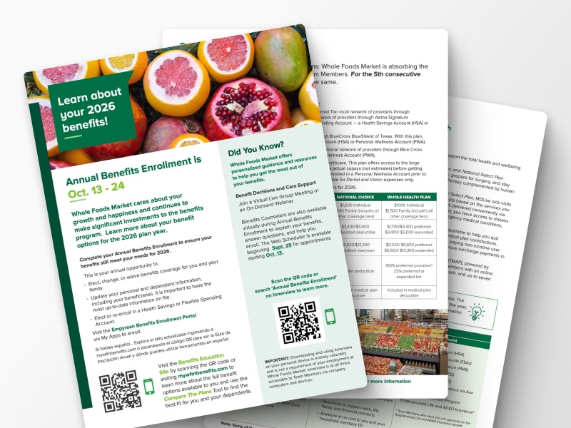 Informational mailers summarizing 2026 benefits changes sent to TMs’ homes – versioned based on TM’s medical plan eligibility.